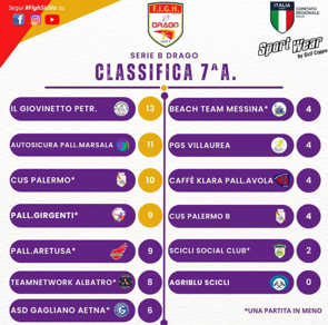 Il Giovinetto Petrosino continua a vincere, ma il Marsala tiene il passo. Questo l’esito della settima giornata di andata del campionato di Serie B Drago di Pallamano Maschile organizzato dal Comitato regionale Figh presieduto da Sandro Pagaria. Infatti se il Giovinetto ha vinto in casa contro il Villaurea, il Marsala ha risposto con una altrettanta vittoria sul campo dell’Agriblu Scicli. Risale in classifica anche il Cus Palermo che ha vinto nettamente lo scontro diretto contro l’Aretusa. Si porta nelle zone alte della classifica anche il Girgenti che espugna il campo del Gagliano.